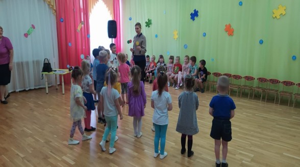 -для детей старшего дошкольного возраста была проведена увлекательная беседа с участием инспектора ГИБДД на которой воспитанники узнали о правилах езды на велосипедах,о важности детских кресел и светоотражающих элементах на одежде во время темного времени суток. Воспитанники с удовольствием отвечали на вопросы инспектора.